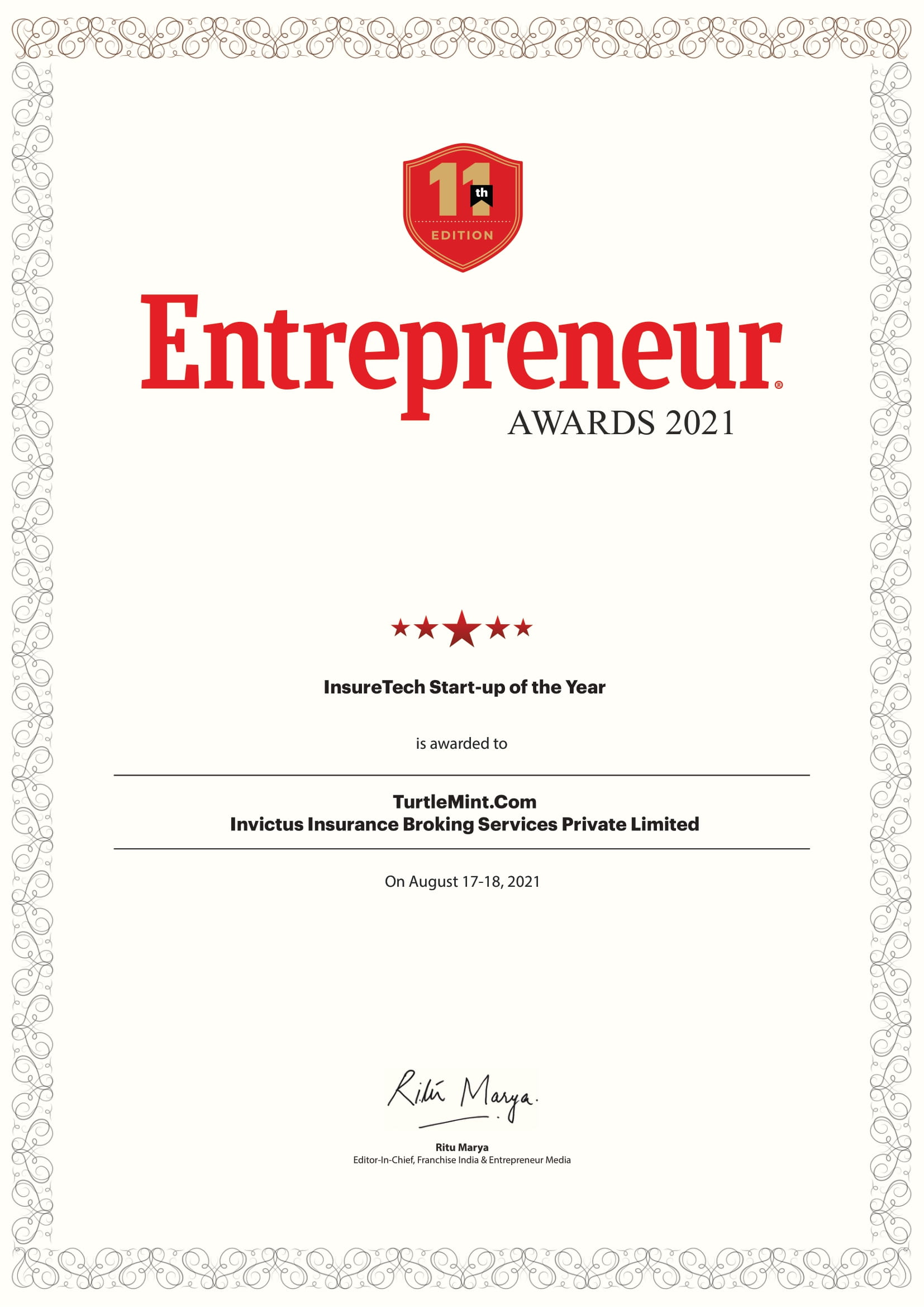 In a recognition of the company’s efforts and the catalytic role that it has played in empowering insurance advisors and promoting insurance penetration in the country, Turtlemint has been awarded the “Insuretech Start-Up of the Year Award” in the “11th Annual Entrepreneur Awards 2021″ by Entrepreneur India. The award is a testimonial of the hardwork and commitment of the Turtlemint’s team and encourages us to continue on this path that we have chosen. Entrepreneur India has a readership of over 3 million and connects to millions of business owners across the world who drive forward with impactful ideas and innovations. For the recently held awards, Entrepreneur India received hundreds of applications in more than 50 categories. Thus, winning this award is a great matter of pride for Turtlemint. The award was received by Dhirendra Mahyavanshi, Co-Founder & CEO of Tutlemint.