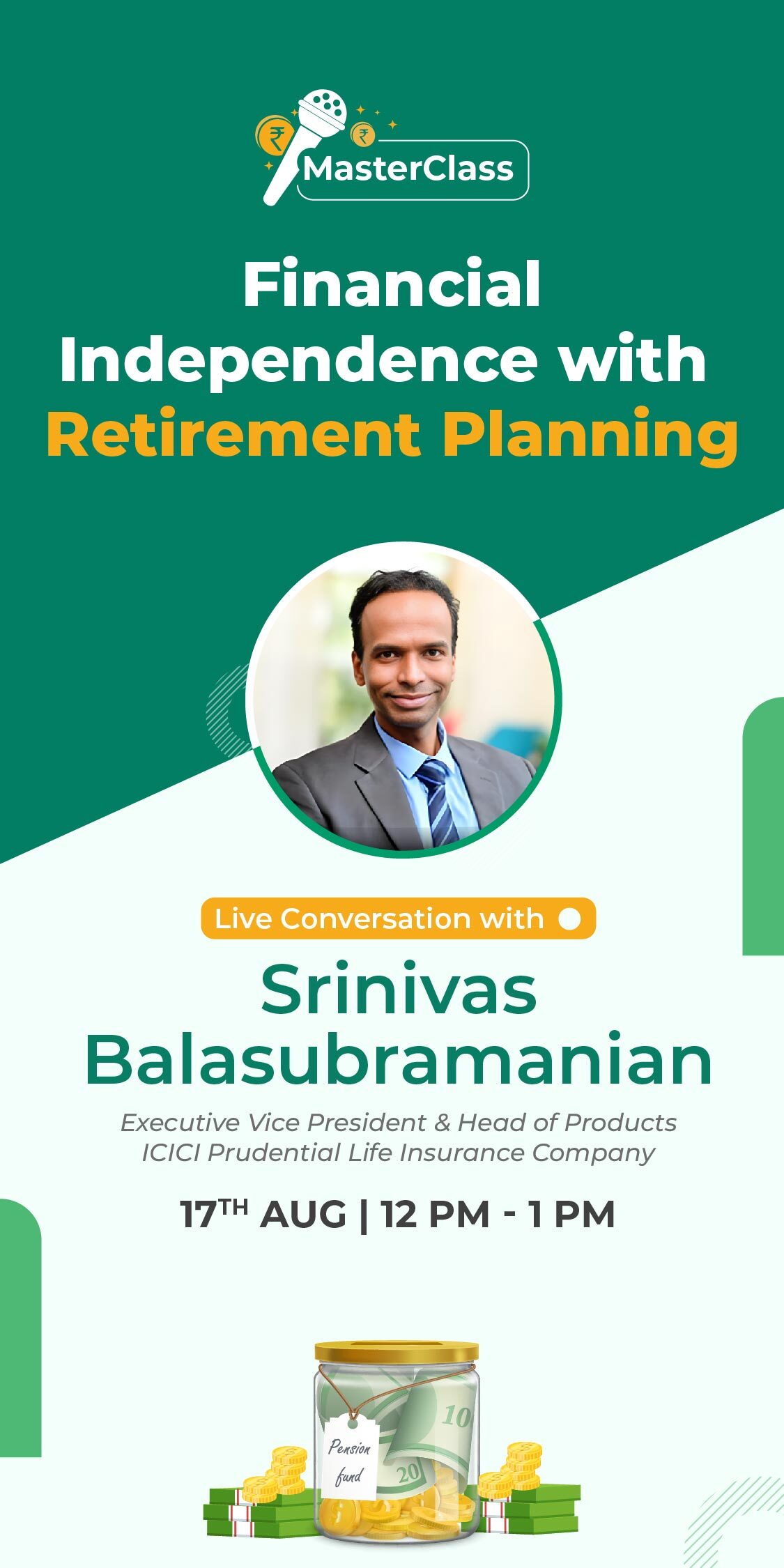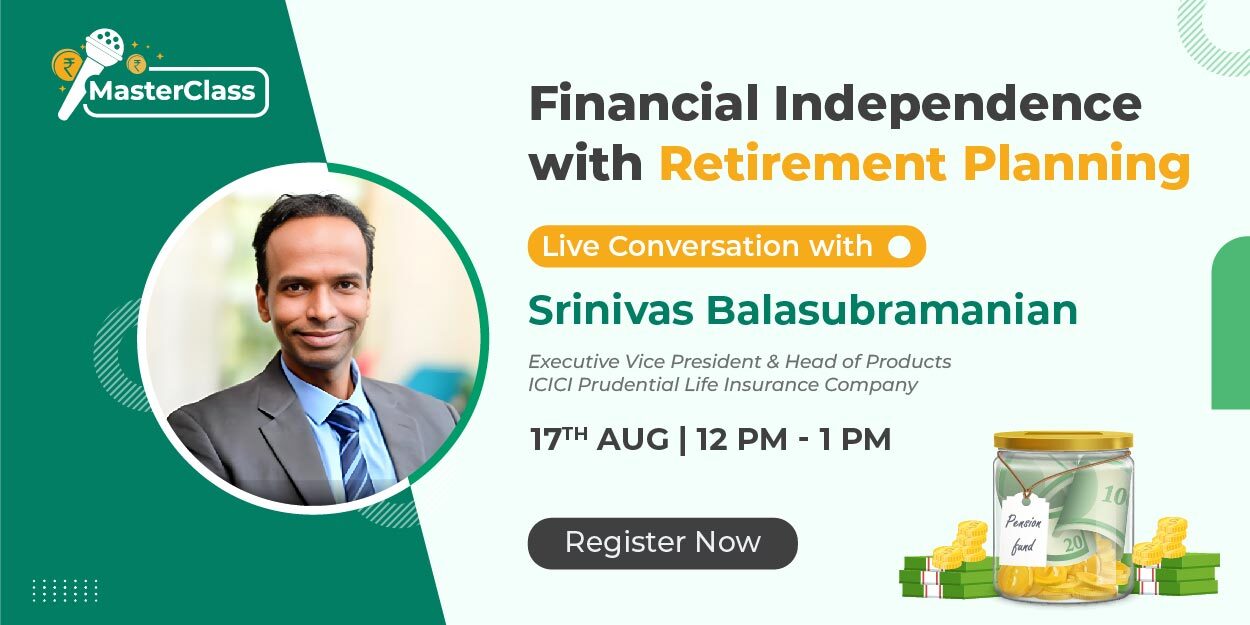 Join us for a masterclass on the topic “Insuring Financial Independence With Retirement Planning” with Mr. Srinivas Balasubramaniam, Executive VP & Head of Products at ICICI Prudential Life Insurance Company Ltd. on 17th August 2023 from 12-1 PM.