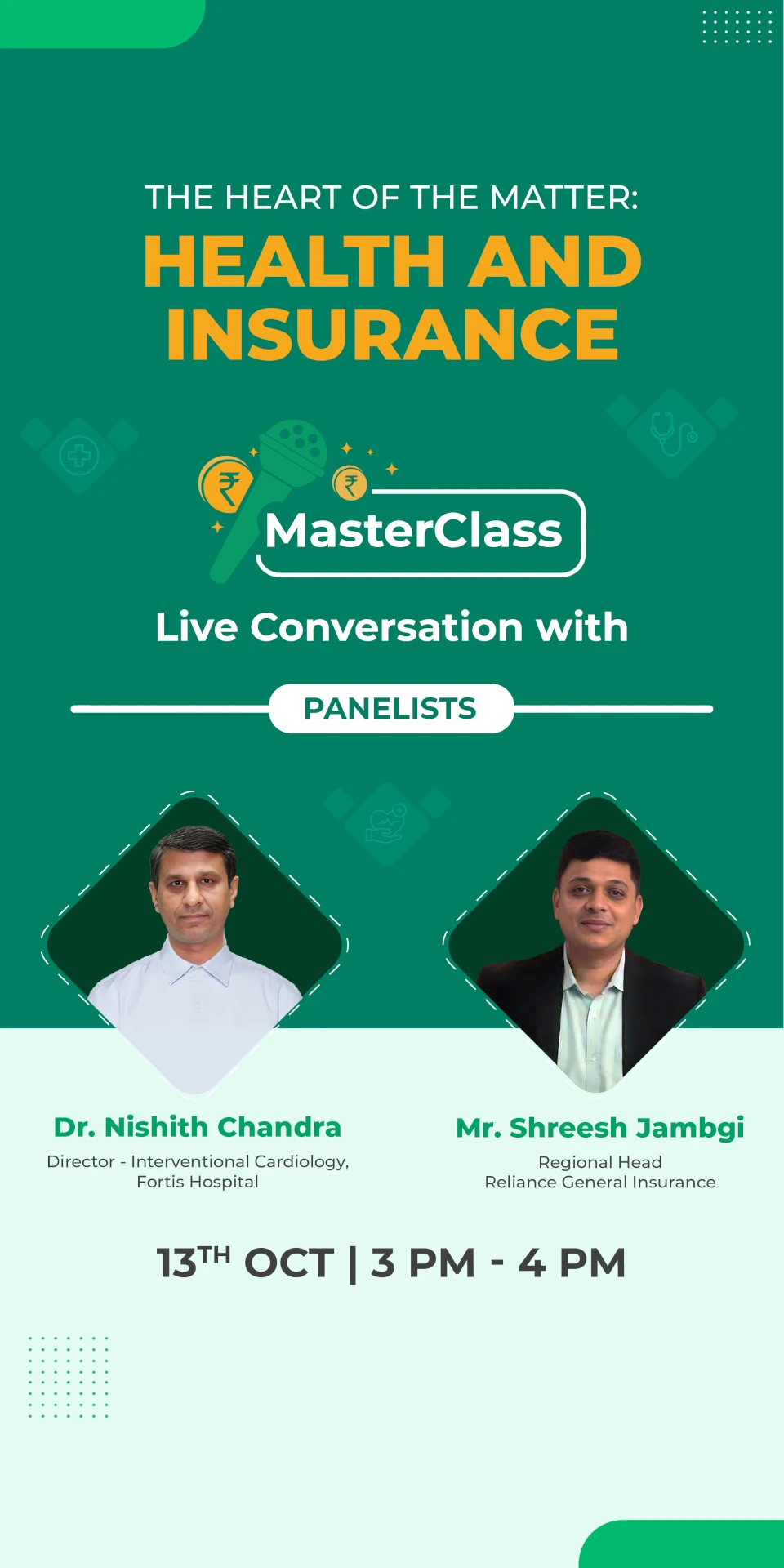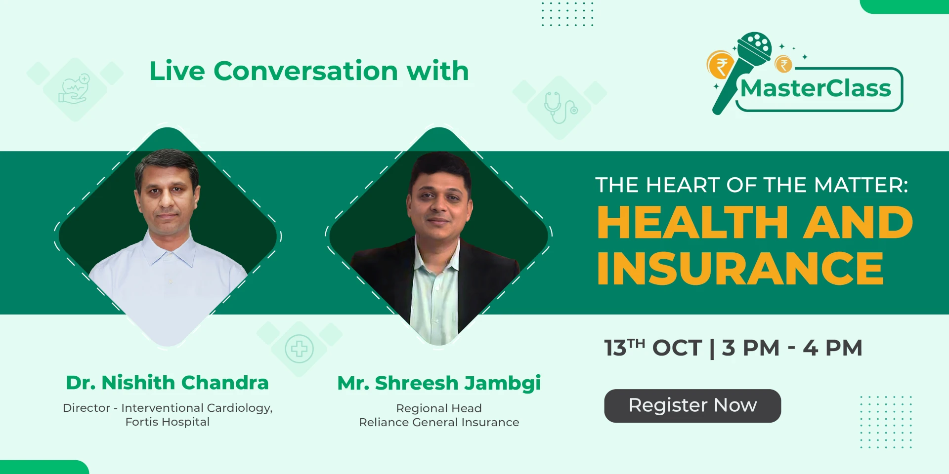This time, our masterclass brings together two experts: a seasoned doctor, Dr. Nishith Chandra who will shed light on heart health and prevention strategies, and an insurance expert Mr Shreesh Jambgi who will demystify the world of health insurance. Together, they’ll equip you with the knowledge and tools to make the right choices for your heart health and finances.